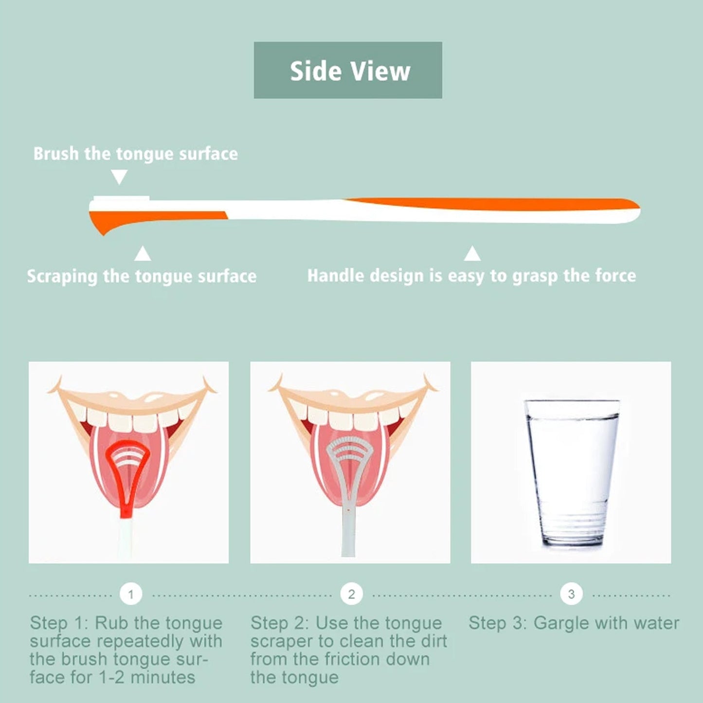 - DOUBLE SIDED AND DOUBLE EFFECTIVE:This product has a double-sided and double effective function, 1side is a smooth tongue scraper that removes most of the tongue moss from the tongue surface, and the other side is a tongue scraper brush with a protrusion that penetrates deep into the crevices of the tongue and cleans the fine stains. The two work in tandem with each other to keep your mouth fresher.