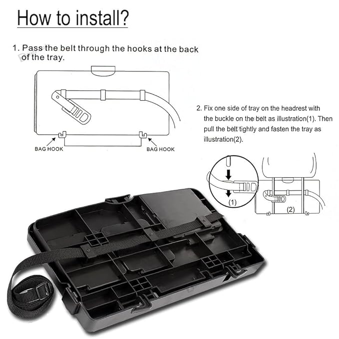 ✨EASY TO INSTALL - The Travel Food and Drink Tray takes just a minute to mount. Simply tie the strap around the headrest frame and adjust for a snug fit. The size of the tray is very compact so you can store it in the back seat pocket when not in use. The bottom portion of the tray has hooks so you can hang your groceries and stuff.