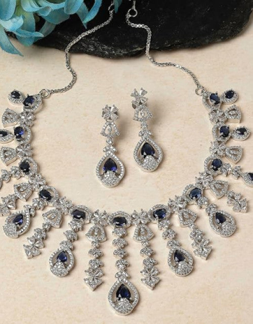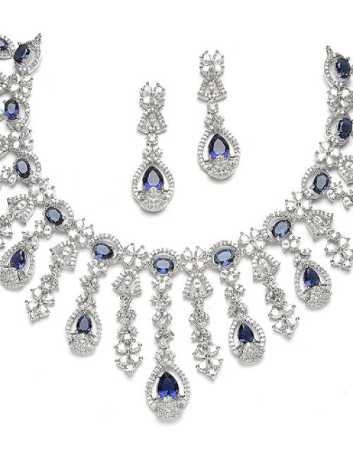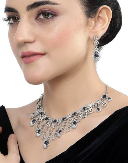 Rhodium-Plated American Diamond Studded Teardrop Tasselled Necklace With Earrings Jewellery Set For Girls and Women